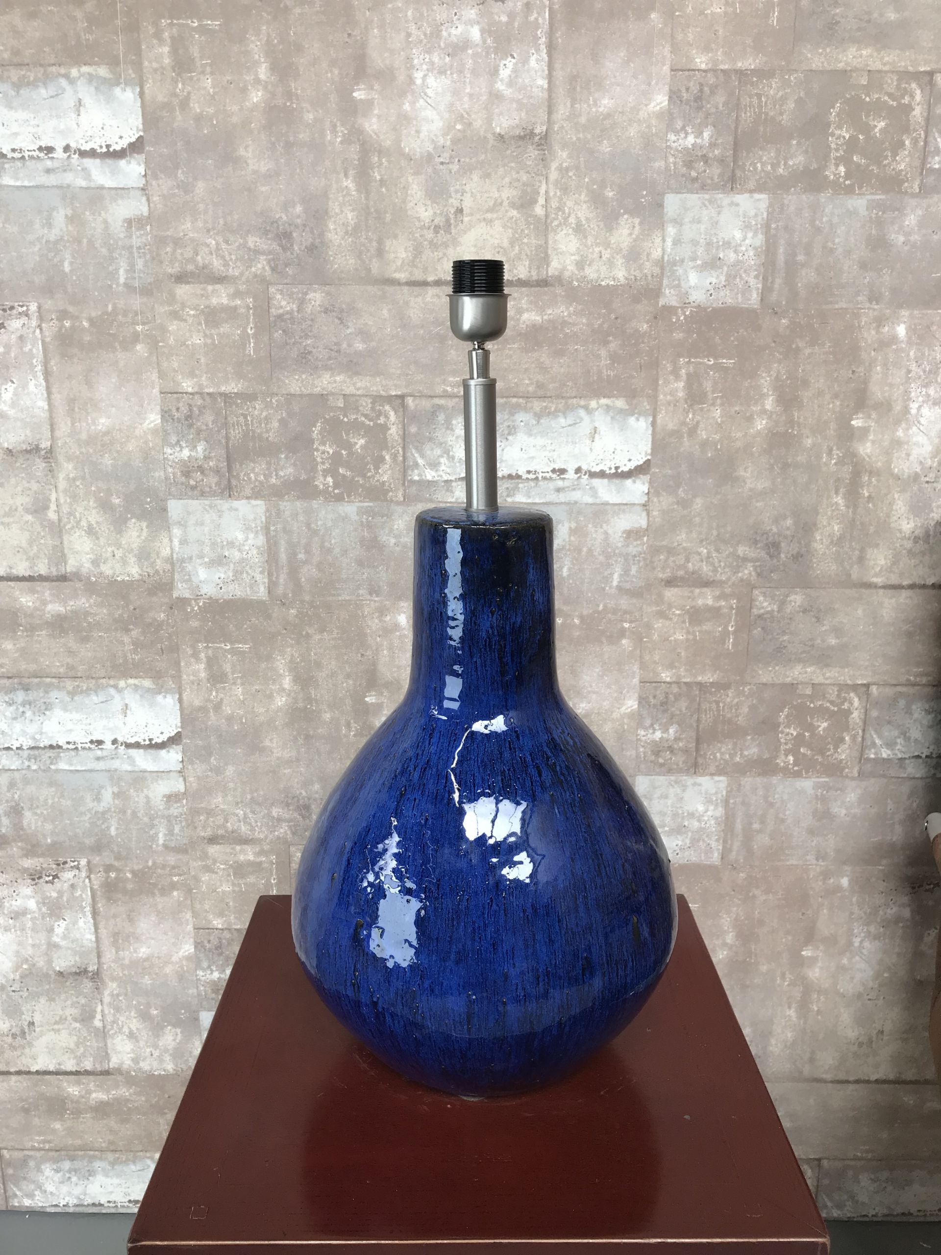 T021216 Tafellamp aardewerk blauw glazuur met creme linnen kap.