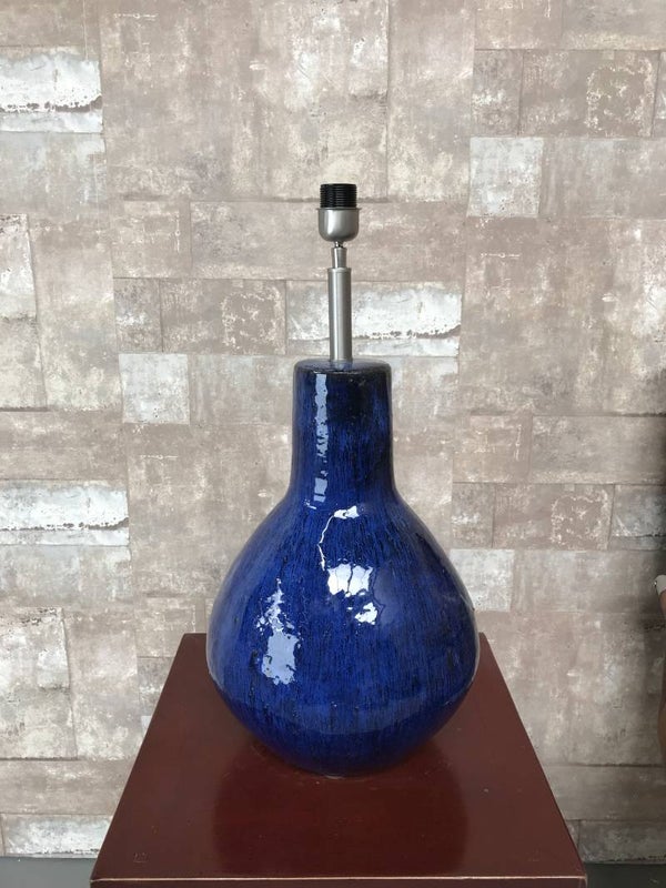 T021216 Tafellamp aardewerk blauw glazuur met creme linnen kap.