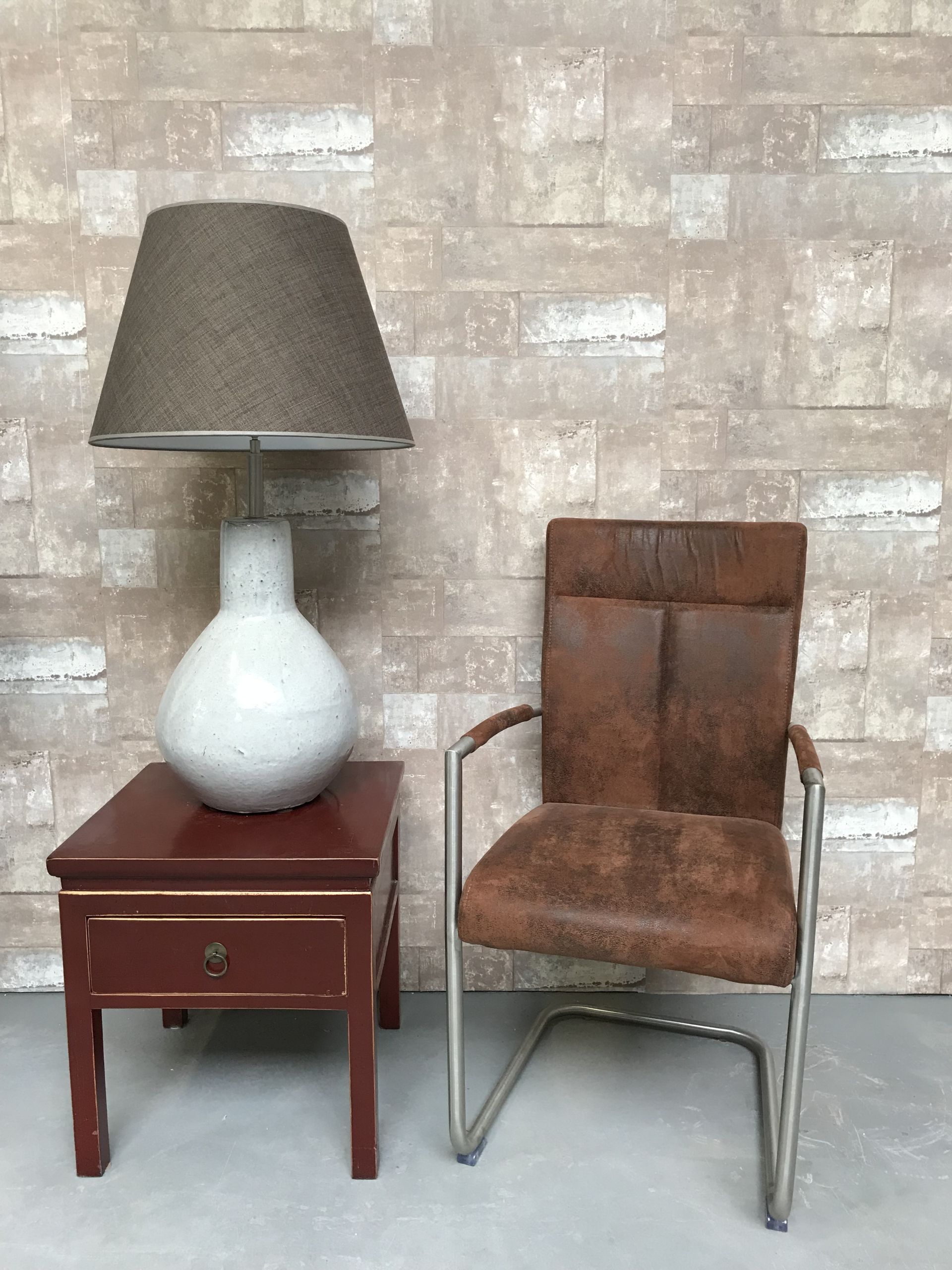 T020701 Tafellamp aardewerk grijs glazuur met donker bruine linnen kap.