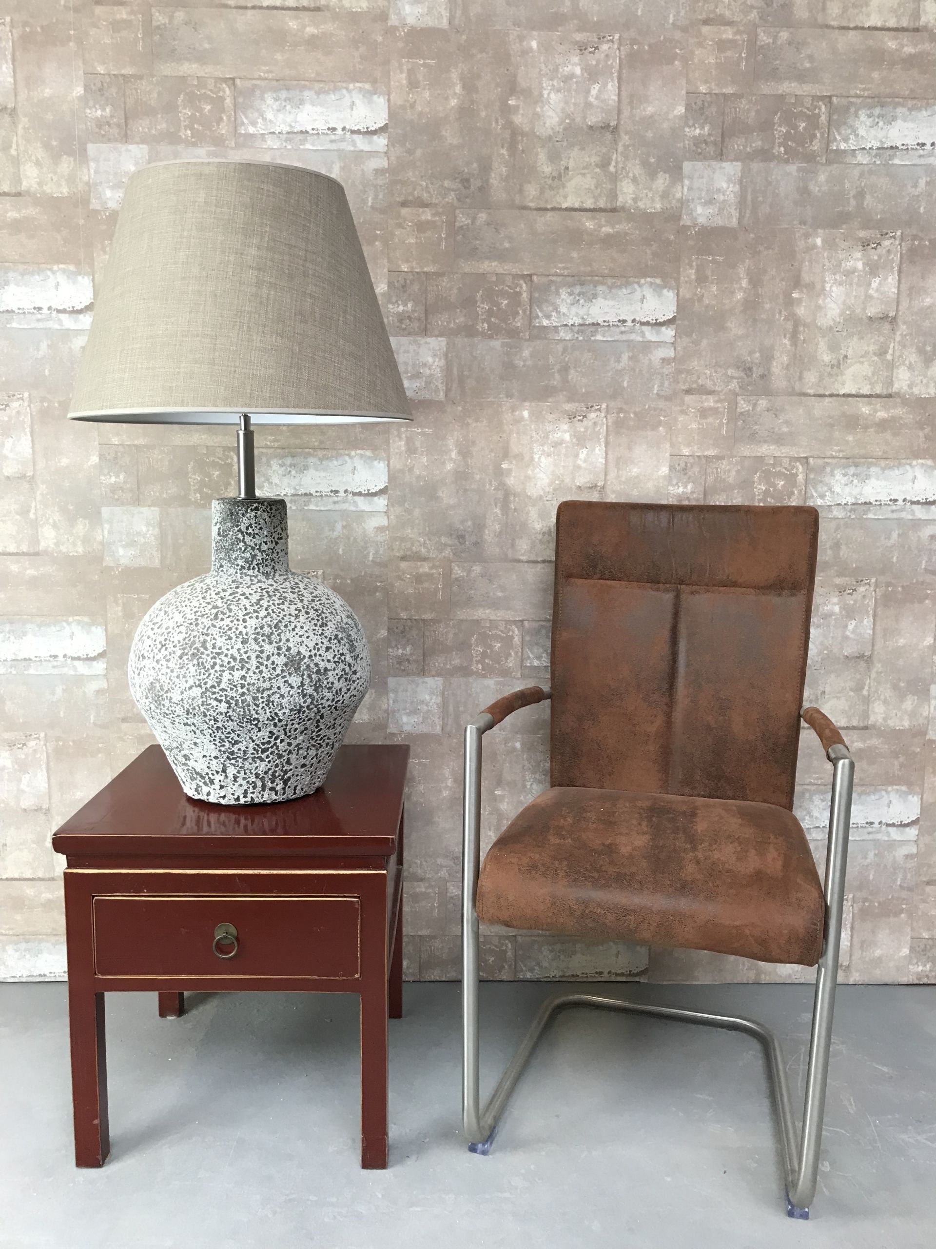 T037906 Tafellamp aardewerk ocean oxciede met licht bruine linnen kap.