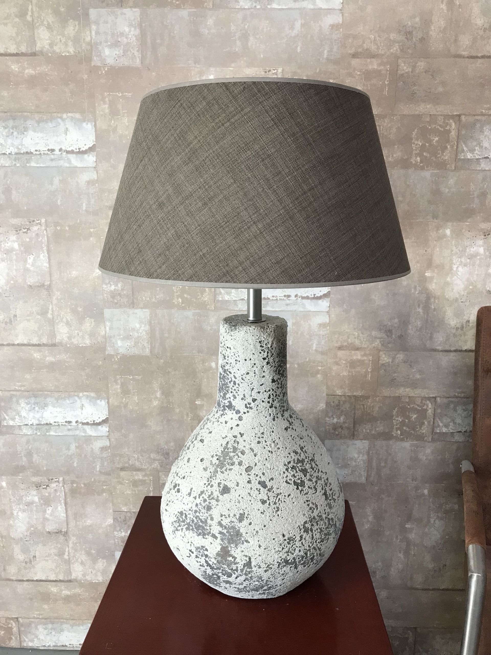T027914 Tafellamp aardewerk ocean oxide met bruine linnen kap.