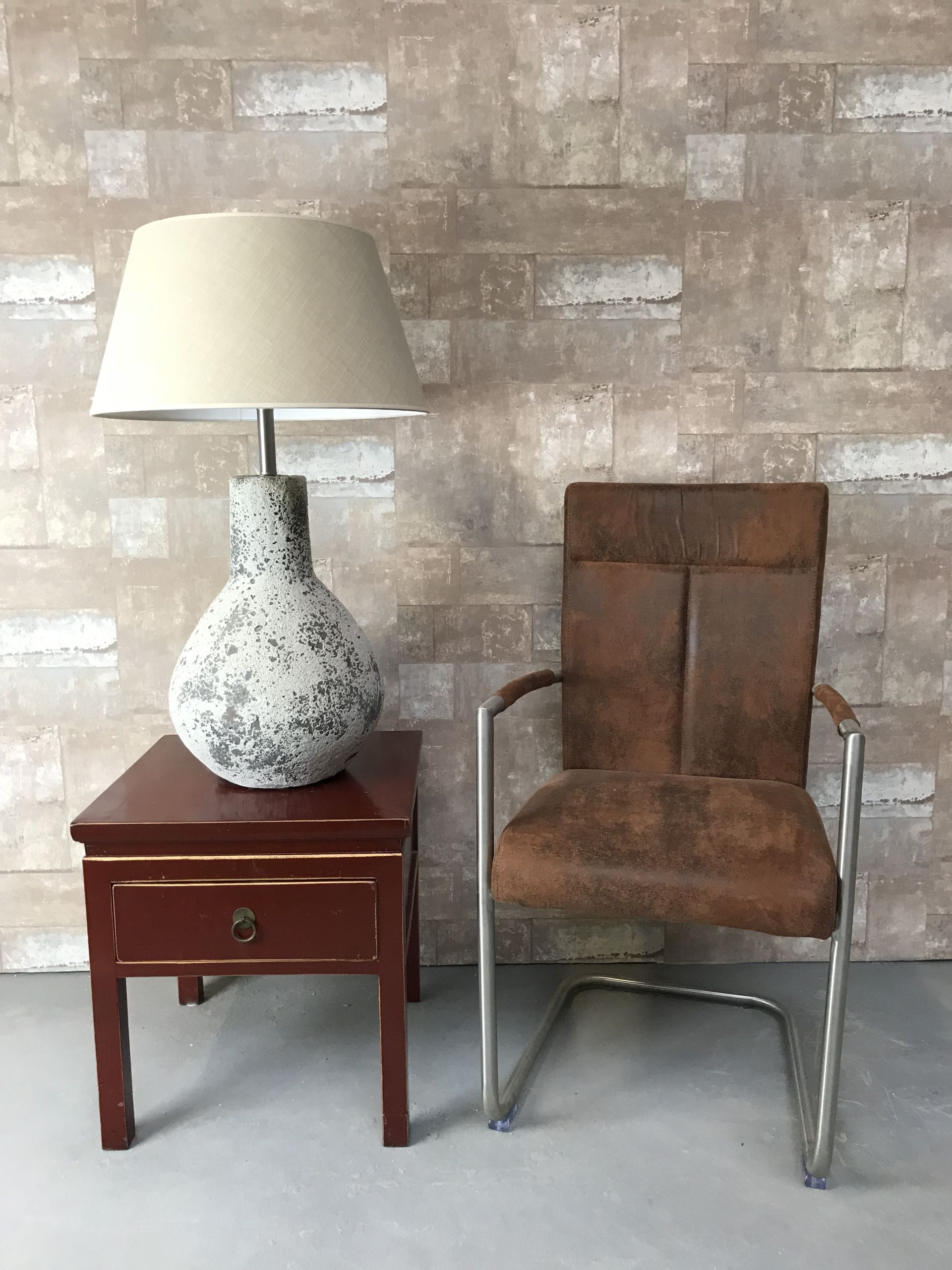 T027913 Tafellamp aardewerk ocean oxide met creme linnen kap.