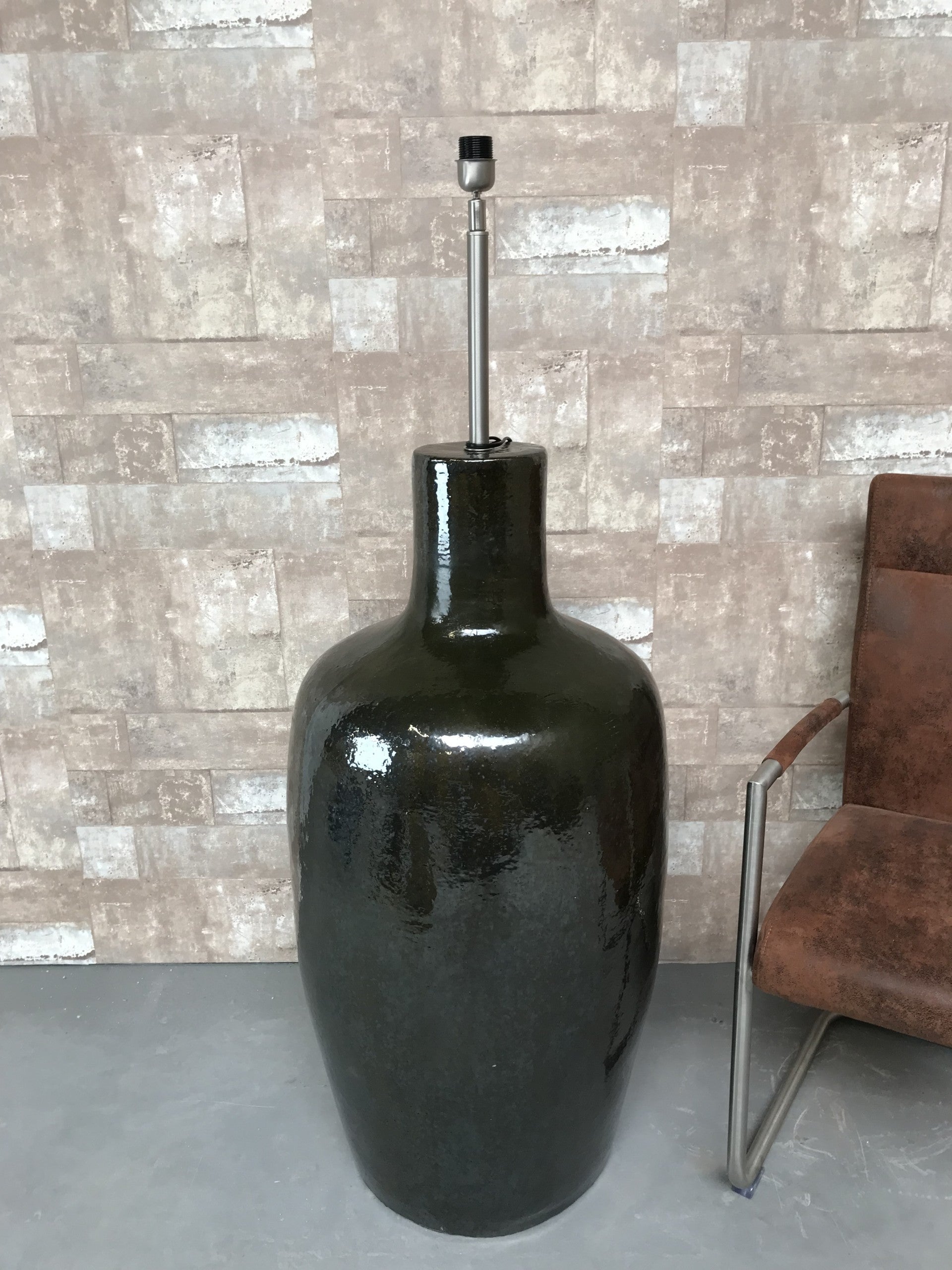 V031431 Vloerlamp aardewerk donker groen glazuur met antraciet linnen kap.