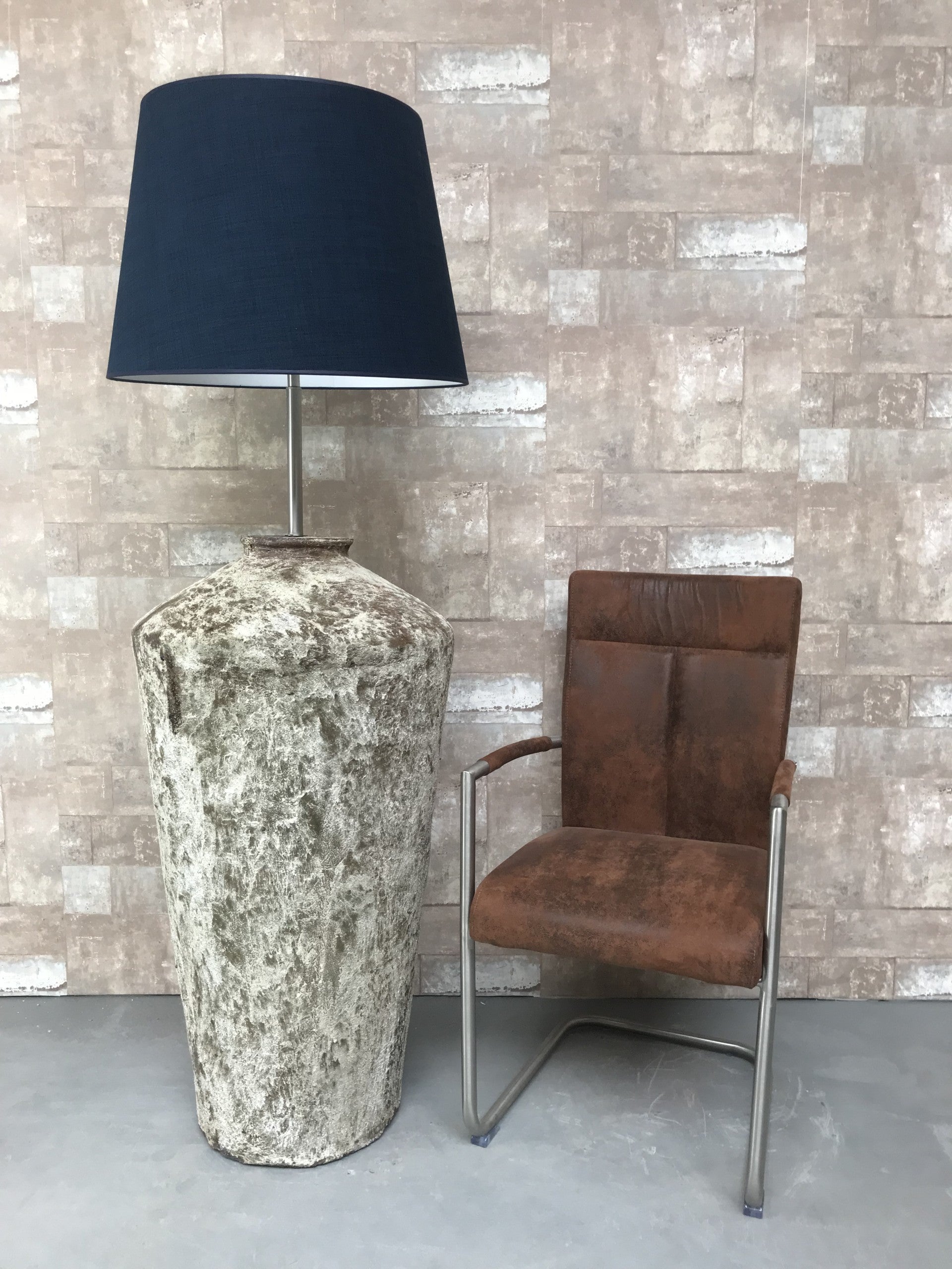 V057930 Vloerlamp aardewerk ocean oxide met donker blauwe linnen kap.