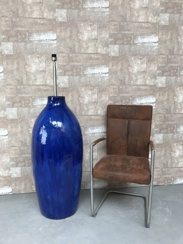 V021228 Vloerlamp aardewerk blauw glazuur met bruine linnen kap.