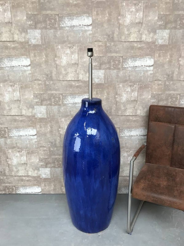 V021230 Vloerlamp aardewerk blauw glazuur met donker blauwe linnen kap.