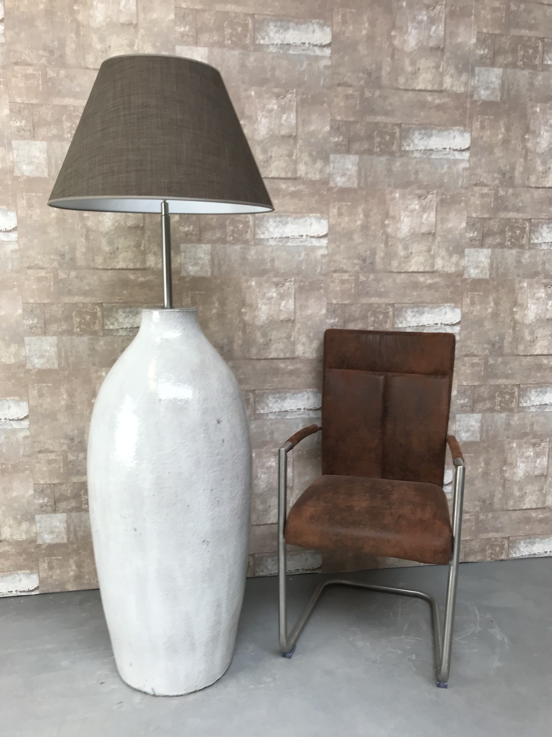 V020728 Vloerlamp aardewerk grijs glazuur met bruine linnen kap.
