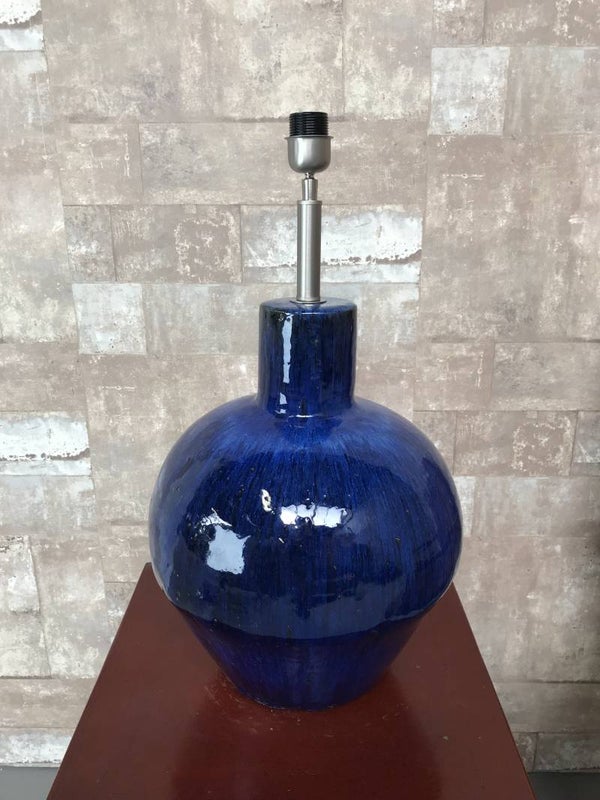 T031208 Tafellamp aardewerk blauw glazuur met donker blauwe linnen kap.